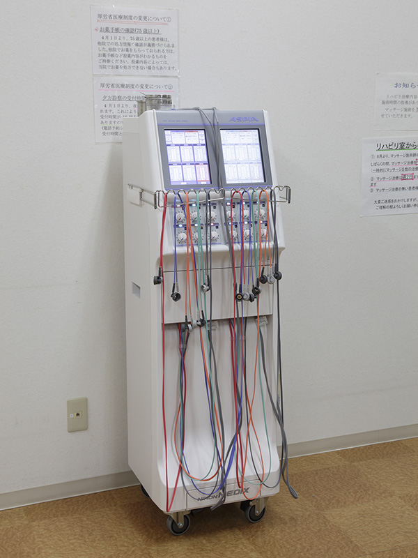 院長・スタッフ紹介 診療時間 診療案内 診療体制 病院案内 設備 アクセス・地図 設備 下記の設備をクリックすると各設備を拡大して表示します。 CTスキャン 一般X線撮影 炭酸ガスレーザー 心電図 食道・胃内視鏡(経口) 低周波治療器(SSP) 赤外線治療器 空気圧マッサージ器(メドマー) 頚椎・腰椎牽引器 水圧刺激マッサージ器 温熱低周波器(トプラー)